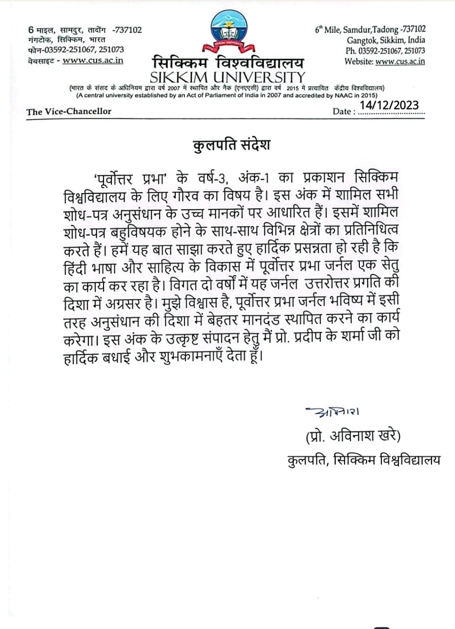 ‘पूर्वोत्तर प्रभा’ के वर्ष-3, अंक-1 का प्रकाशन सिक्किम विश्वविद्यालय के लिए गौरव का विषय है। इस अंक में शामिल सभी शोध-पत्र अनुसंधान के उच्च मानकों पर आधारित हैं। इसमें शामिल शोध-पत्र बहुविषयक होने के साथ-साथ विभिन्न क्षेत्रों का प्रतिनिधित्व करते हैं। हमें यह बात साझा करते हुए हार्दिक प्रसन्नता हो रही है कि हिंदी भाषा और साहित्य के विकास में पूर्वोत्तर प्रभा जर्नल एक सेतु का कार्य कर रहा है। विगत दो वर्षों में यह जर्नल उत्तरोत्तर प्रगति की दिशा में अग्रसर है। मुझे विश्वास है, पूर्वोत्तर प्रभा जर्नल भविष्य में इसी तरह अनुसंधान की दिशा में बेहतर मानदंड स्थापित करने का कार्य करेगा। इस अंक के उत्कृष्ट संपादन हेतु मैं प्रो. प्रदीप के शर्मा जी को हार्दिक बधाई और शुभकामनाएँ देता हूँ।